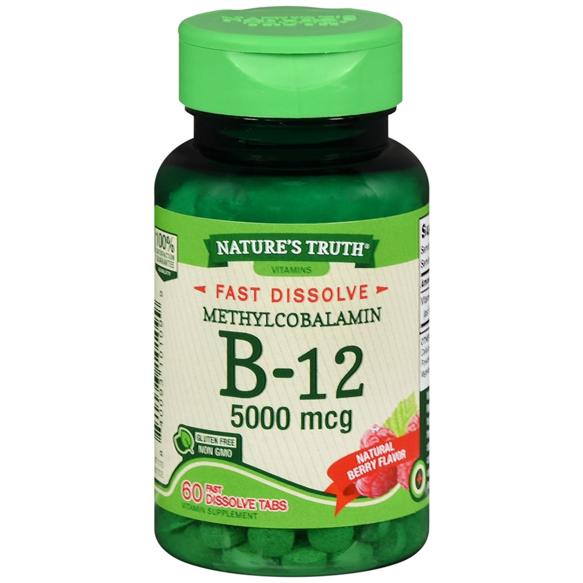 Active Ingredients 1 Fast Dissolve Tablet: Vitamin B-12 (Methylcobalamin) 5,000 mcg; Mannitol; Natural Flavors; Beet Root Powder; Vegetable Stearic Acid; Cellulose (Plant Origin); Dextrose; Crospovidone; Vegetable Magnesium Stearate; Silica; Sucralose Directions For adults, take one (1) fast dissolve tablet daily, preferably with a meal. Purpose Vitamins & Dietary Supplements Warnings If you are pregnant, nursing or taking any medications, consult your doctor before use. If any adverse reactions occur, immediately stop using this product and consult your doctor. Keep out of reach of children. Store in a cool, dry place.