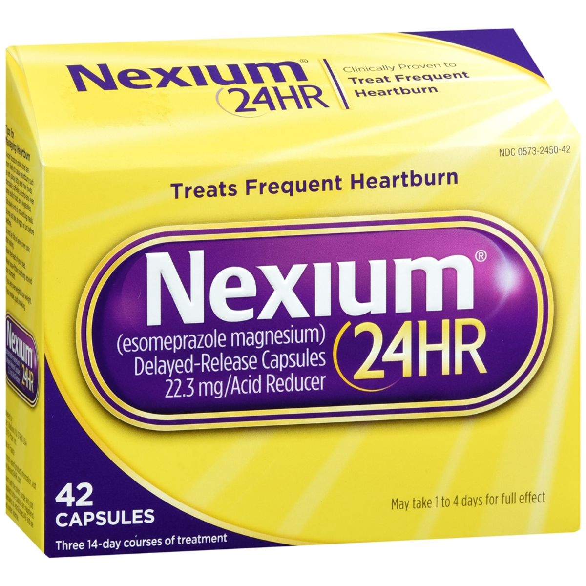 Active Ingredients In Each Capsule: Esomeprazole 20 mg (Each Delayed-Release Capsule Corresponds to 22.3 mg Esomeprazole Magnesium Trihydrate) Uses Treats frequent heartburn (occurs 2 or more days a week). Not intended for immediate relief of heartburn; this drug may take 1 to 4 days for full effect. Includes 42 delayed-release capsules, three 14-day courses of treatment. 3 bottles inside. 24 hour. Purpose Acid Reducer