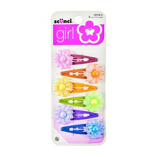 Snap clips with flowers for girls. 6 per card. Come in assorted bright colors including green, blue, pink, yellow, purple and orange.Asst