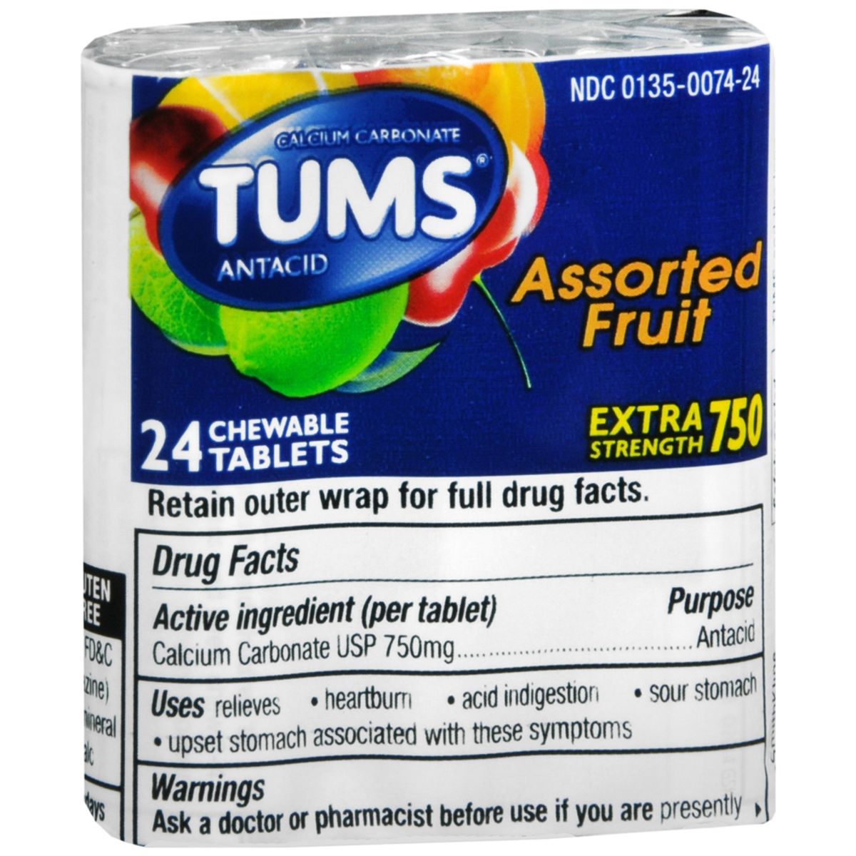 Active Ingredients Per Tablet: Calcium Carbonate 750 mg Inactive Ingredients Adipic Acid; Corn Starch; FD&C Blue # 1 Lake; FD&C Red # 40 Lake. FD&C Yellow # 5 (Tartrazine) Lake; FD&C Yellow # 6 Lake; Flavors; Mineral Oil; Sodium Polyphosphate; Sucrose; Talc; Each tablet contains: Elemental Calcium 300 mg, Sodium 2 mg. Uses Relieves; Heartburn; acid indigestion, sour stomach; upset stomach associated with these symptoms. Directions Adults and children 12 years of age and over: Chew 2-4 tablets as symptoms occur, or as directed by a doctor. Do not take for symptoms that persist for more than 2 weeks unless advised by a doctor. Purpose Antacid