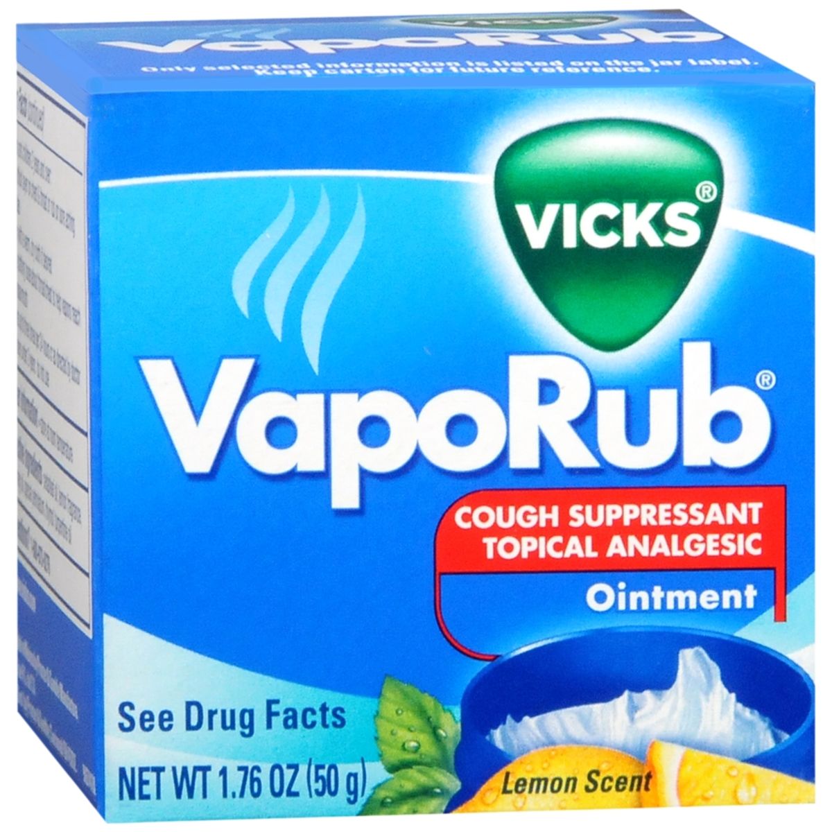 Active Ingredients Camphor 4.7 %; Eucalyptus Oil 1.2 %; Menthol 2.6 % Inactive Ingredients Cedarleaf Oil; Lemon Fragrance; Nutmeg Oil; Special Petrolatum; Thymol; Turpentine Oil Uses On chest and throat, temporarily relieves cough due to common cold. On muscles and joints, temporarily relieves minor aches and pains. Purpose Cough Suppressant, Topical Analgesic